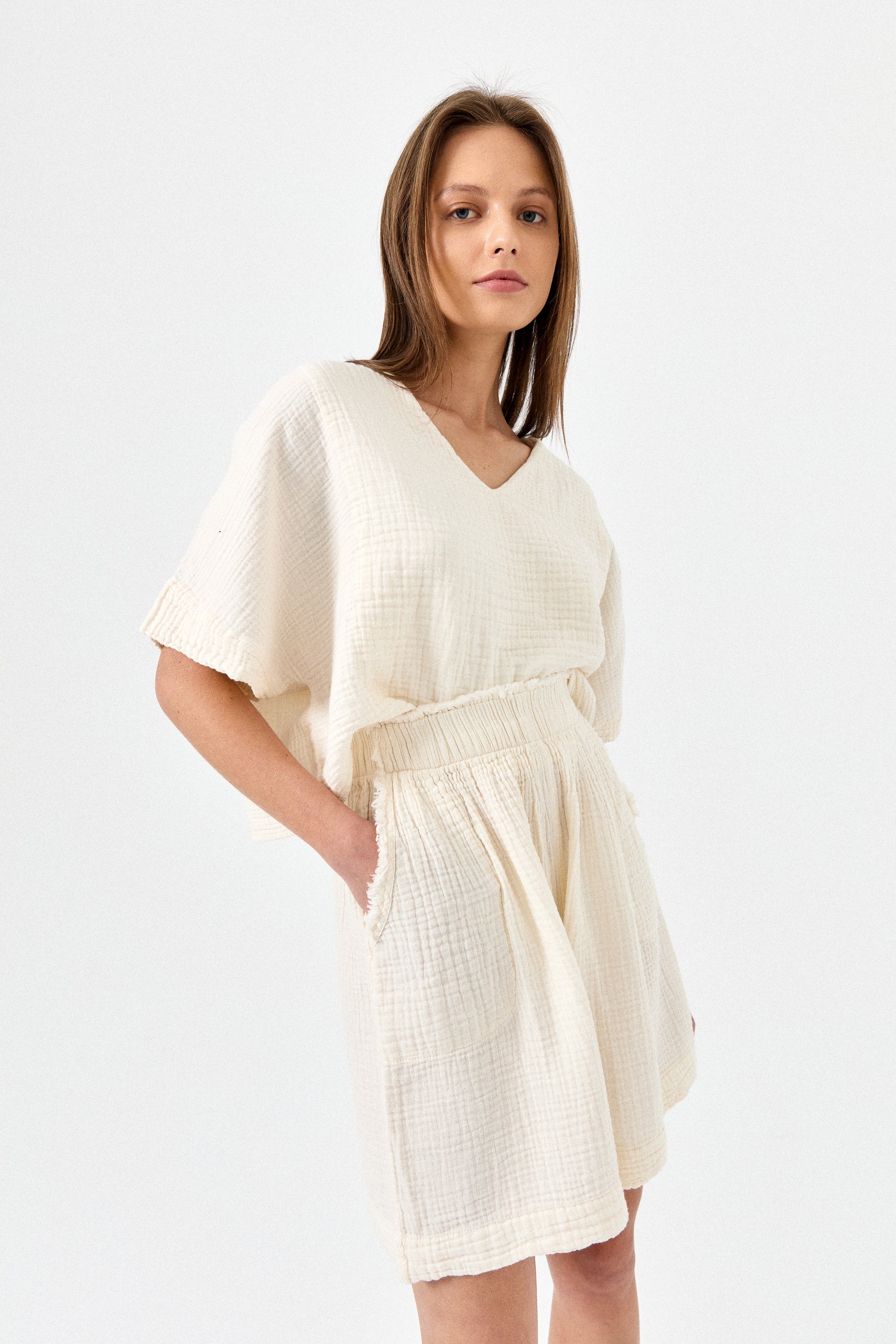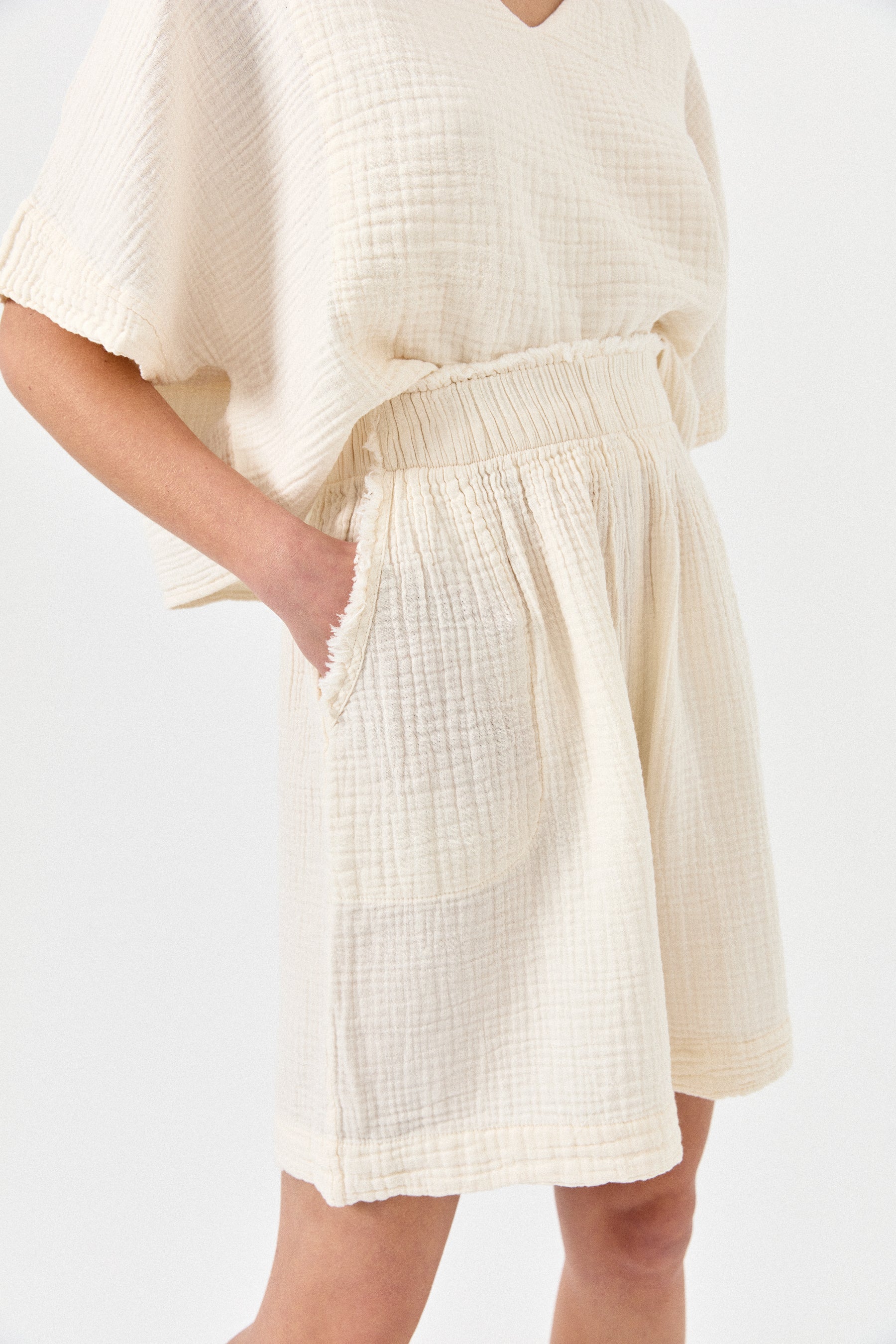 These crinkle shorts are designed for all-day comfort. Featuring an elastic waistband, a relaxed fit and 100% crinkle cotton fabric for breathability, they provide effortless style for your casual days.
