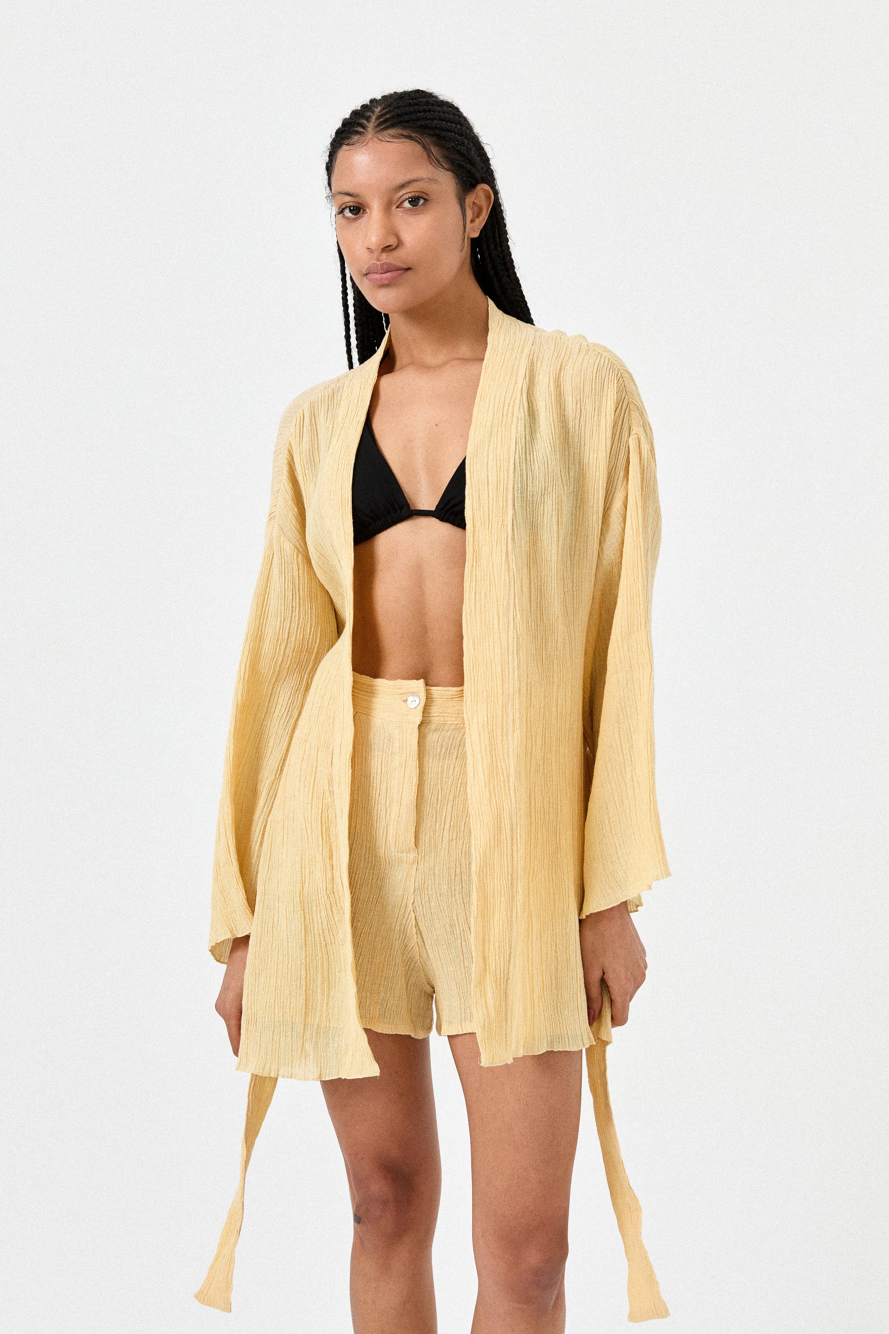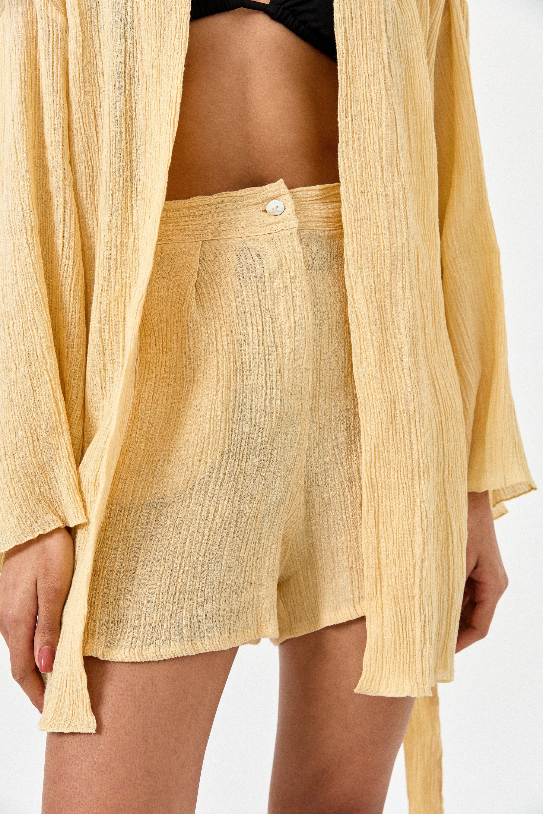 The textured yellow hue and shell button closure bring an elegant look with the comfort of an elastic waistband. Create the perfect summer look with the pretty details of these crinkle linen shorts. Limited quantity.