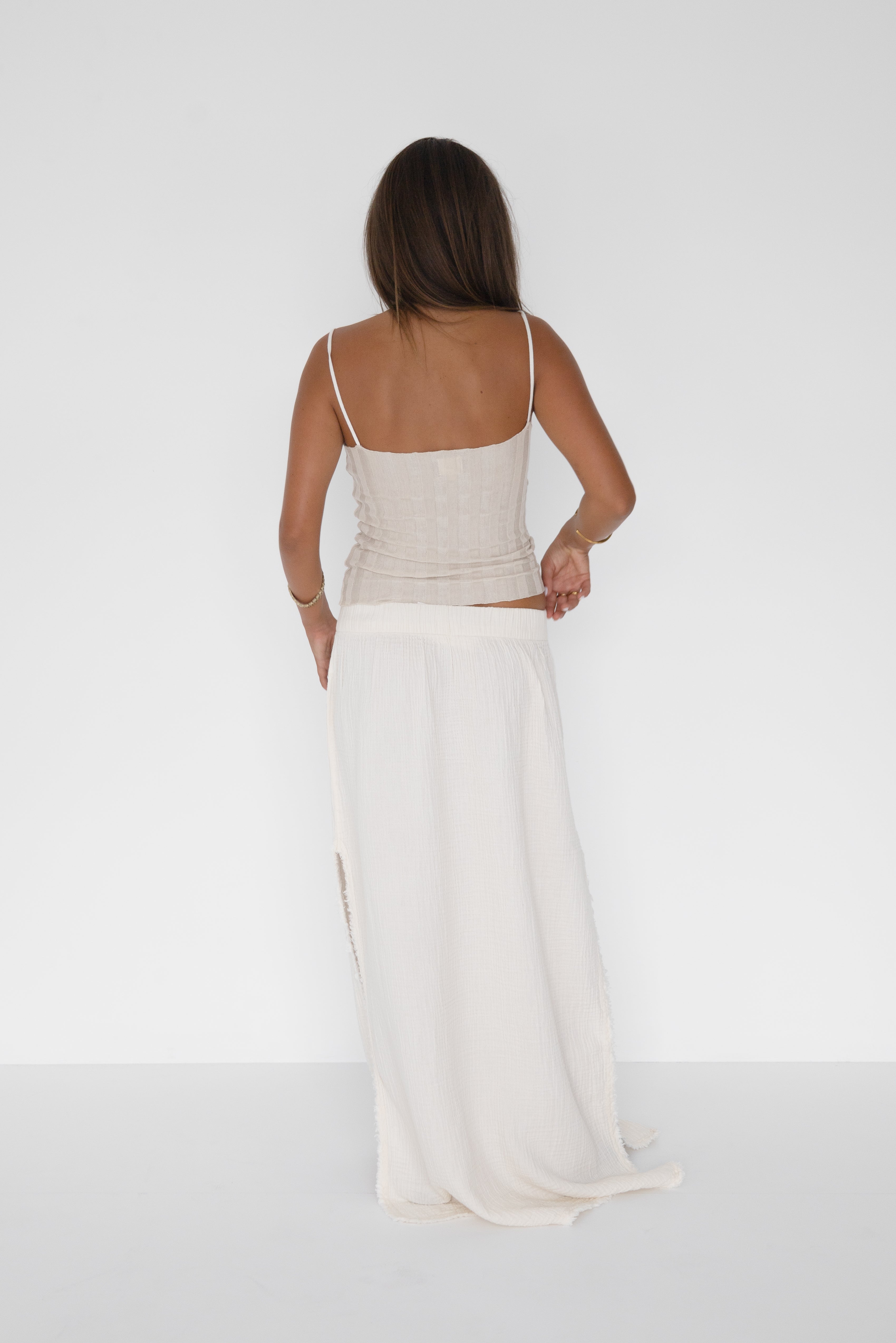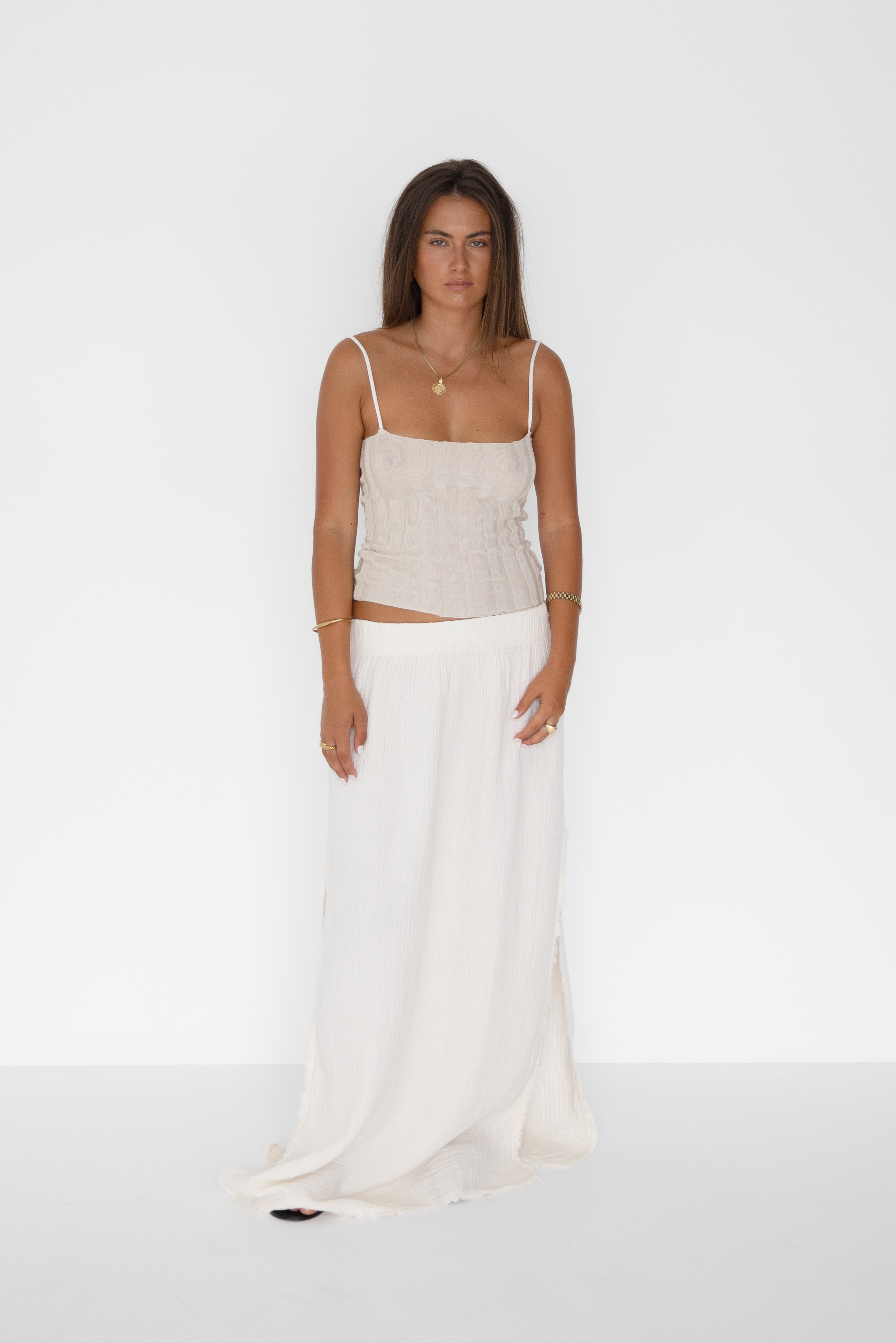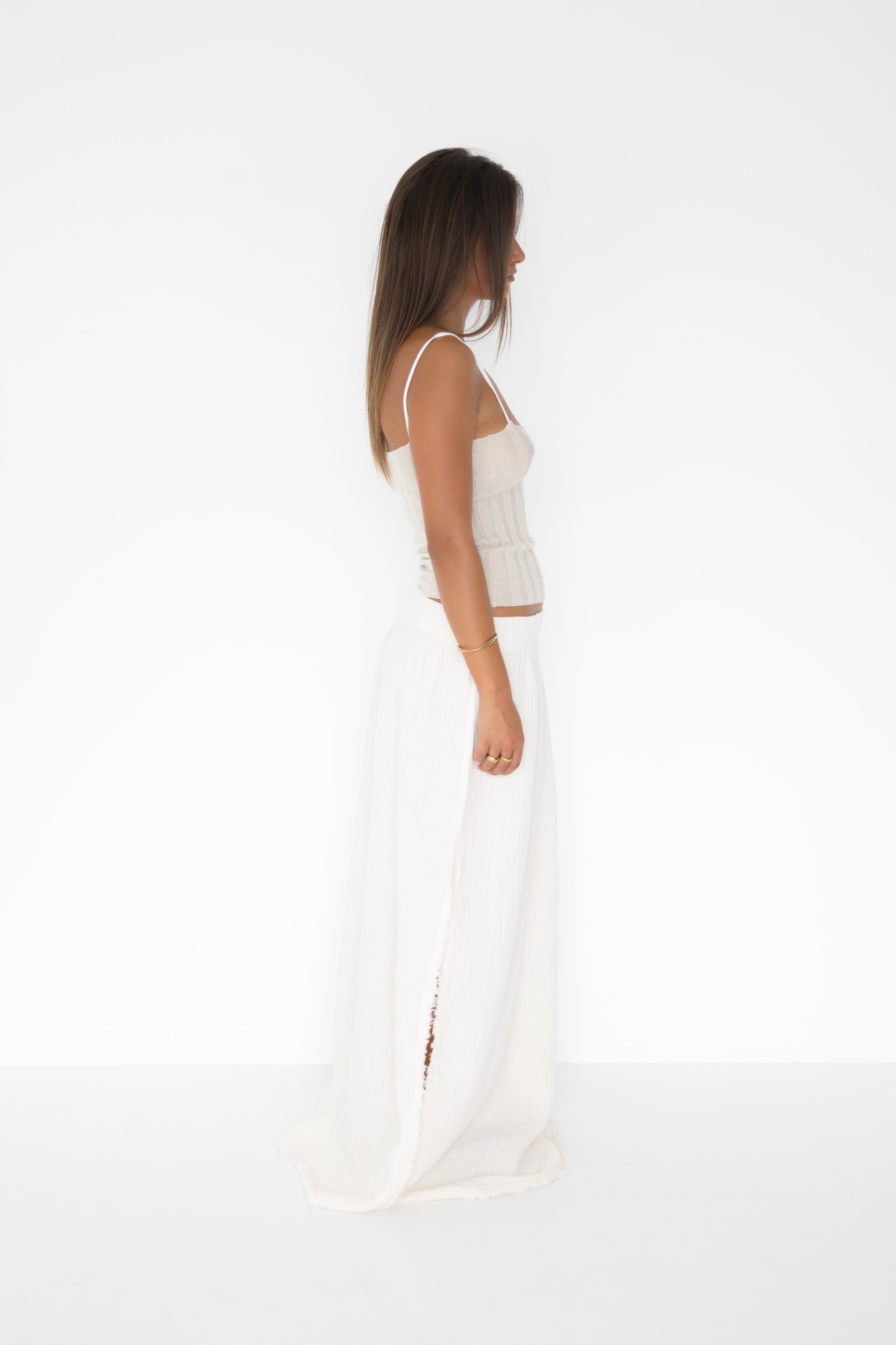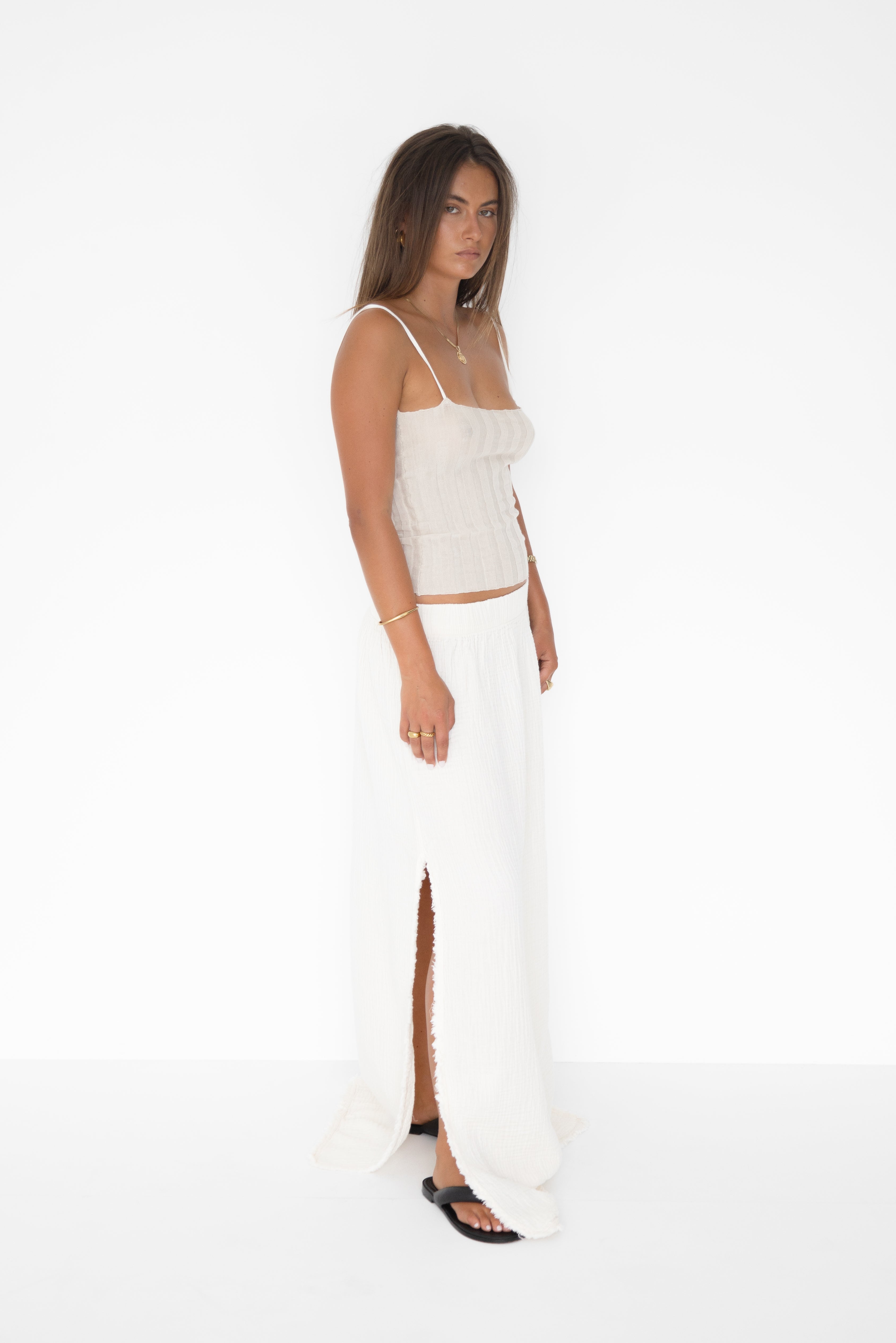This cotton crinkle slit skirt offers a soft and relaxed fit with a beautiful texture. Perfect for a casual yet chic look.