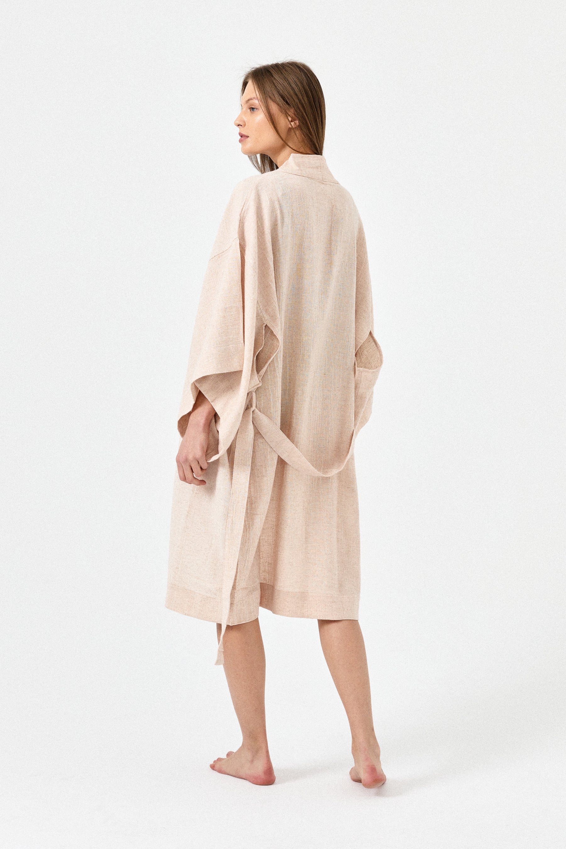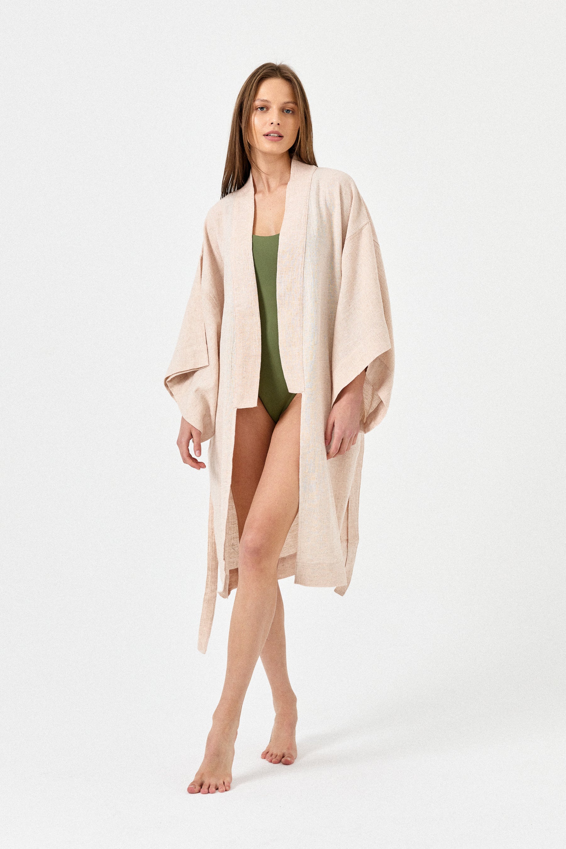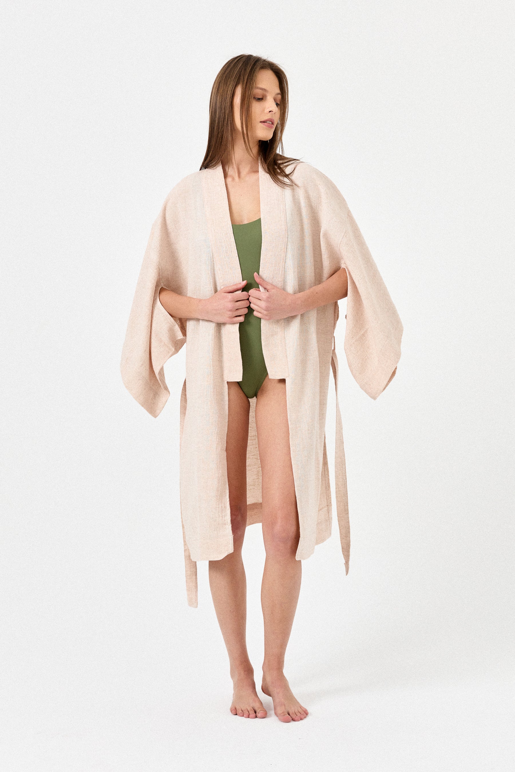 This lightweight linen blend kimono features wide sleeves with slits, a soft rosy hue and a relaxed silhouette. Great to wear over your swimsuit for a day at the beach.