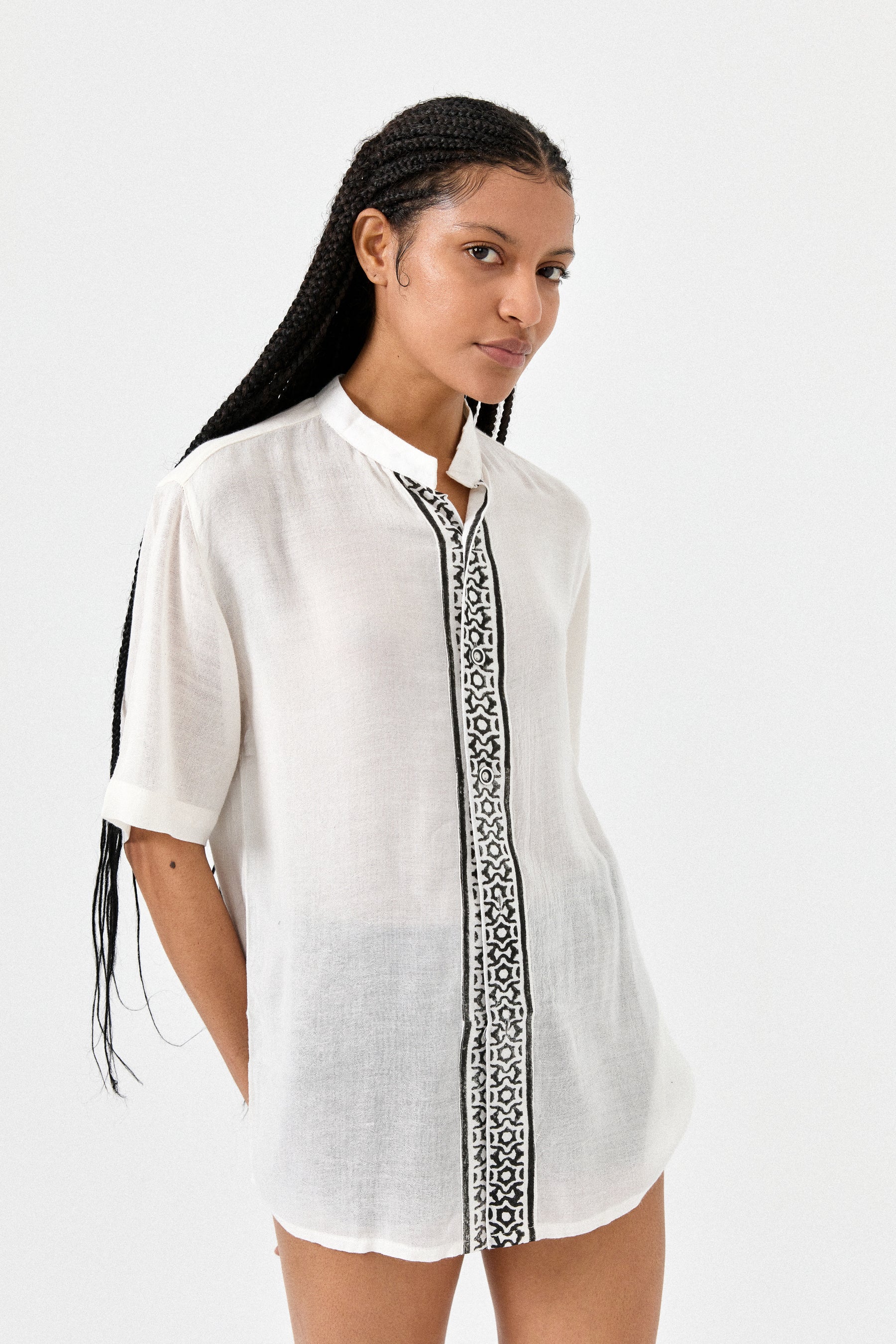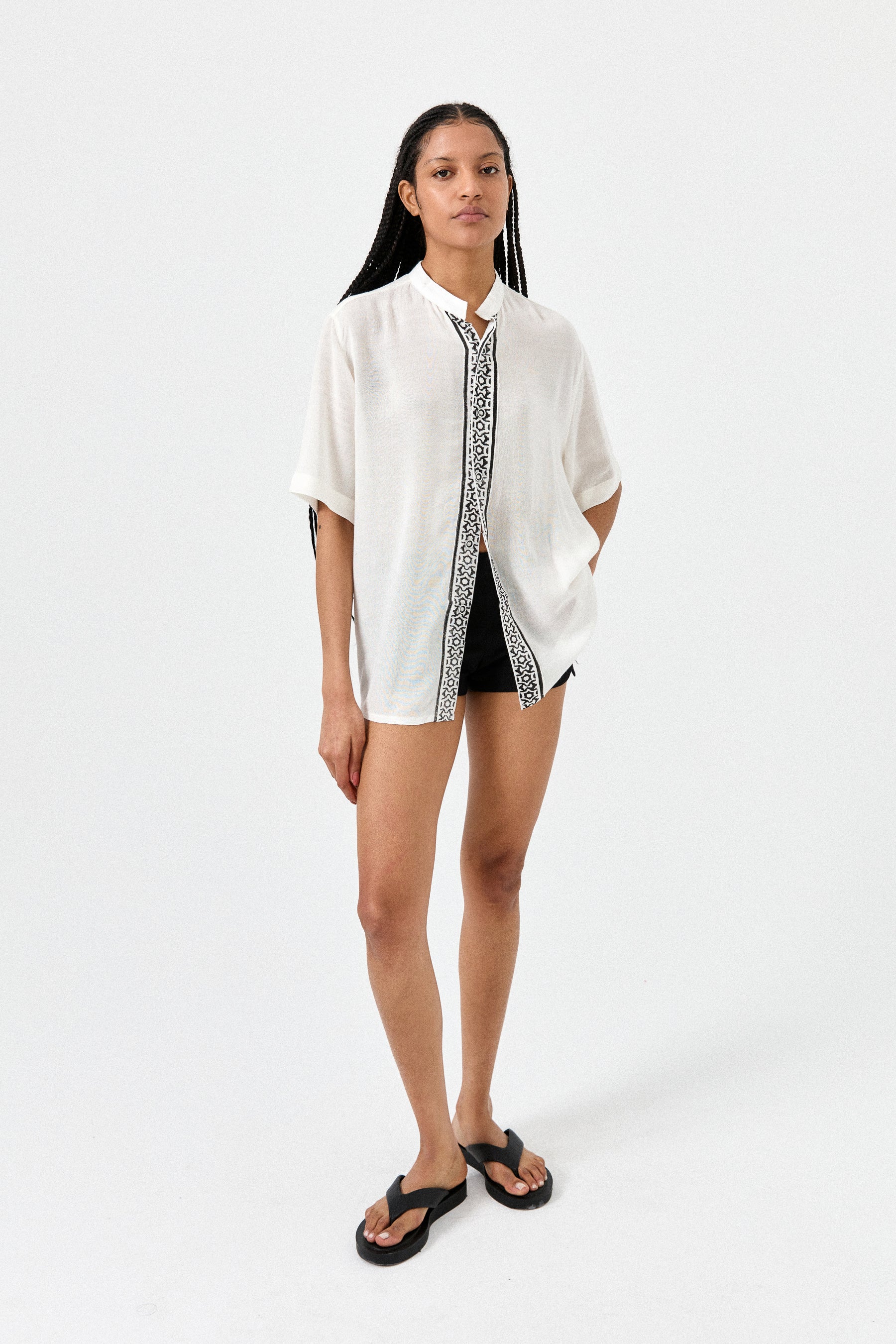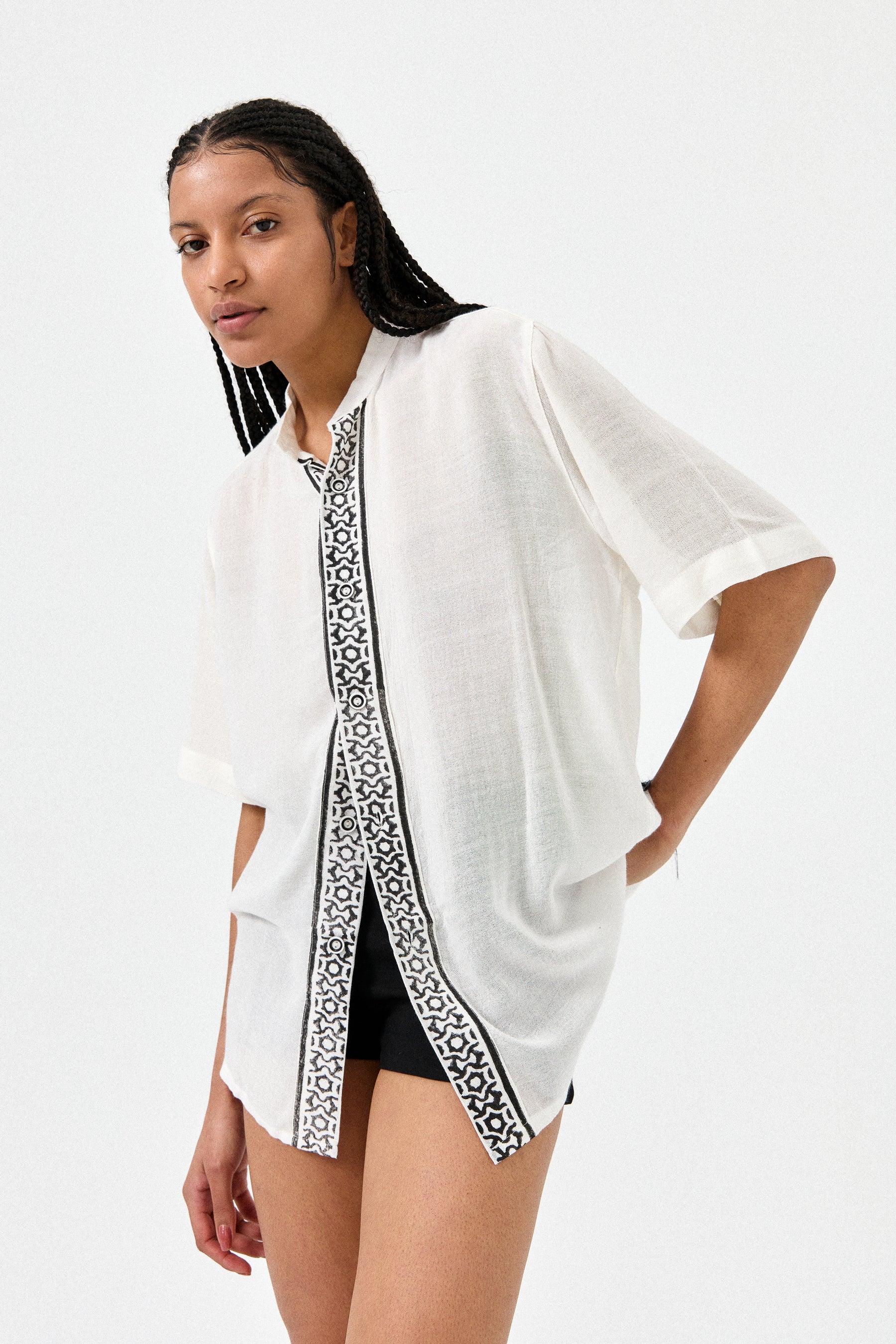 The bamboo shirt features a lightweight and airy design, making it the perfect for warm days. Its unisex, oversized fit is versatile and the print detail adds a unique touch. Style it with jeans and sandals for a casual but chic look.