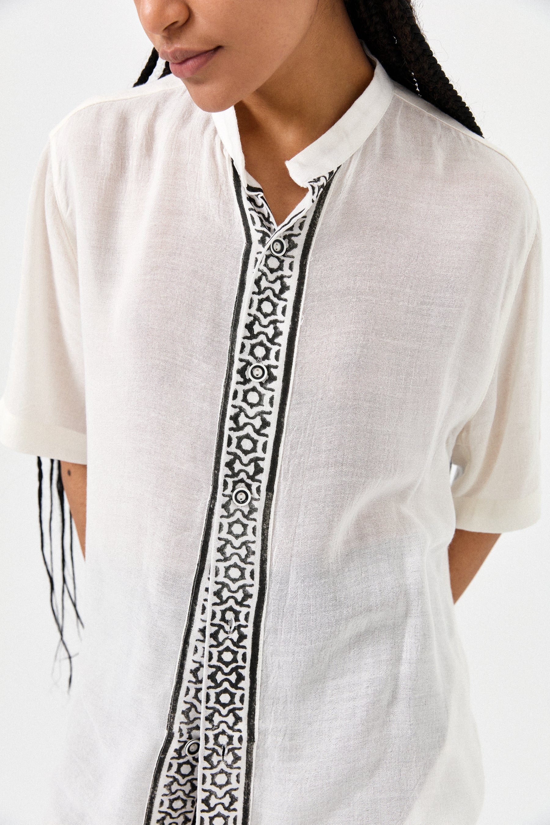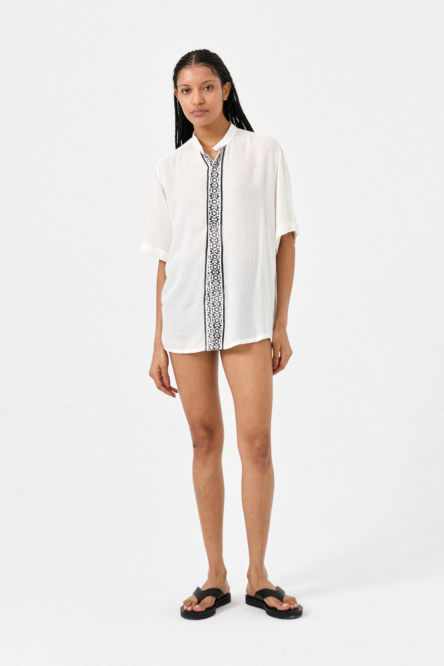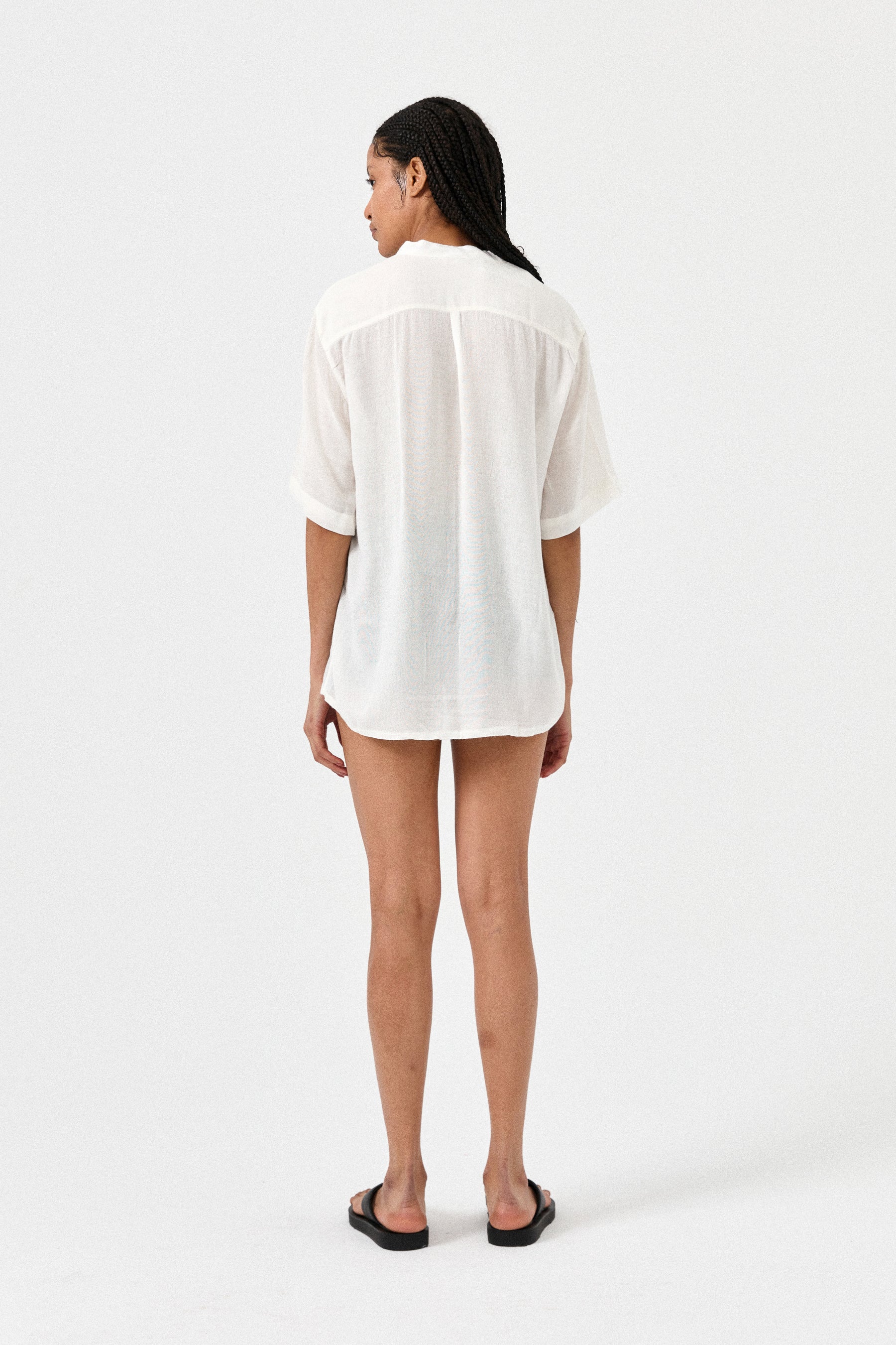 The bamboo shirt features a lightweight and airy design, making it the perfect for warm days. Its unisex, oversized fit is versatile and the print detail adds a unique touch. Style it with jeans and sandals for a casual but chic look.
