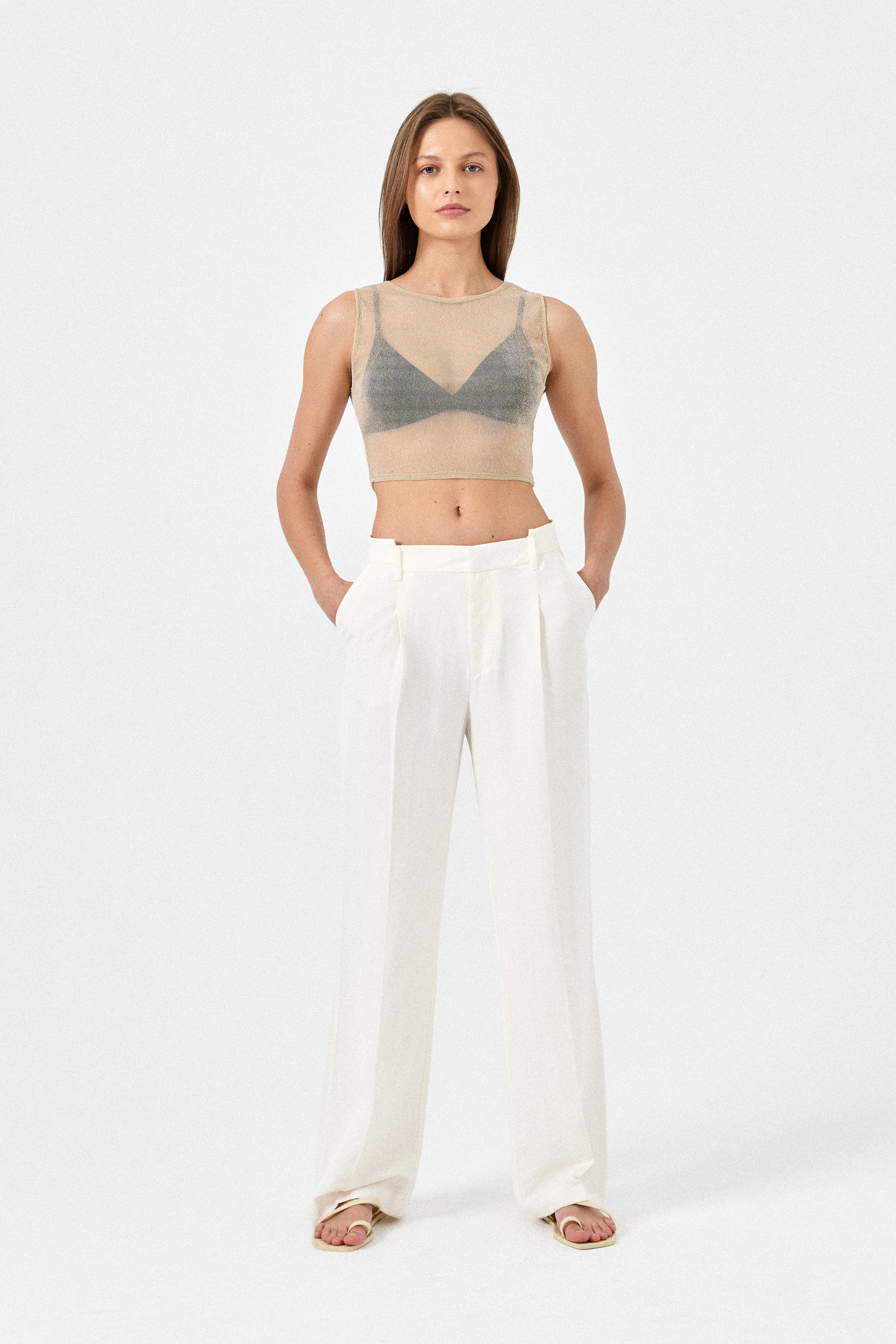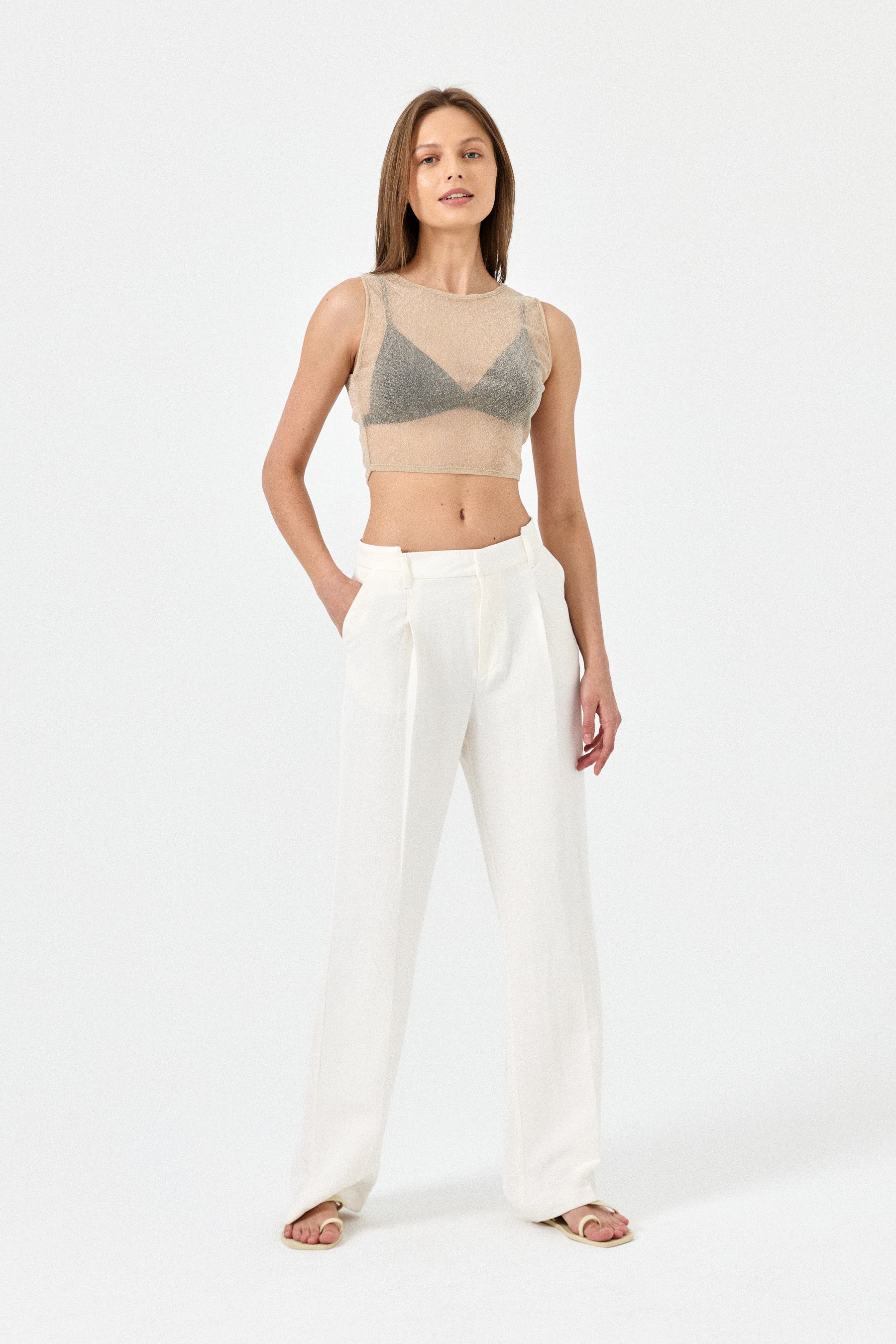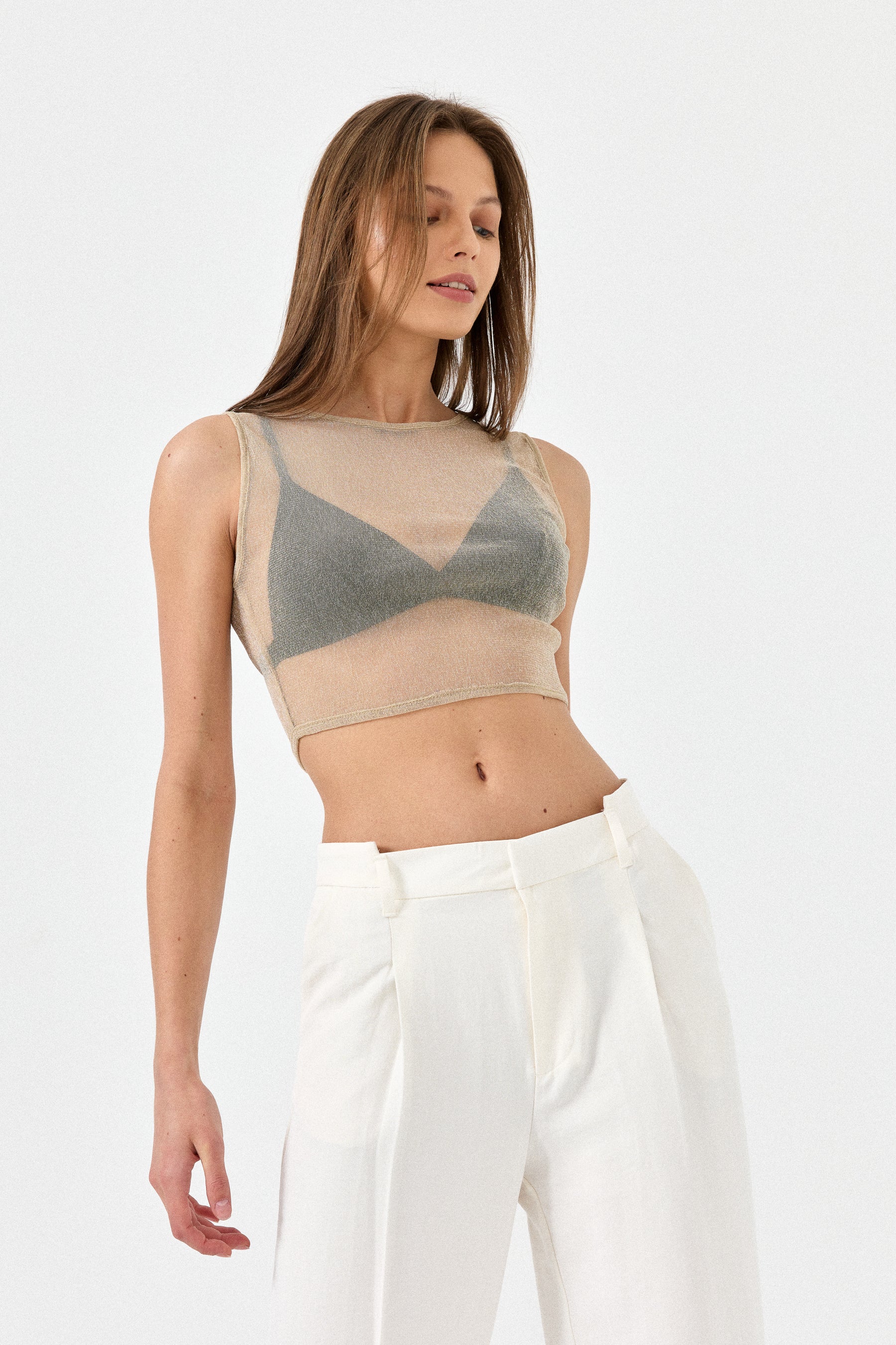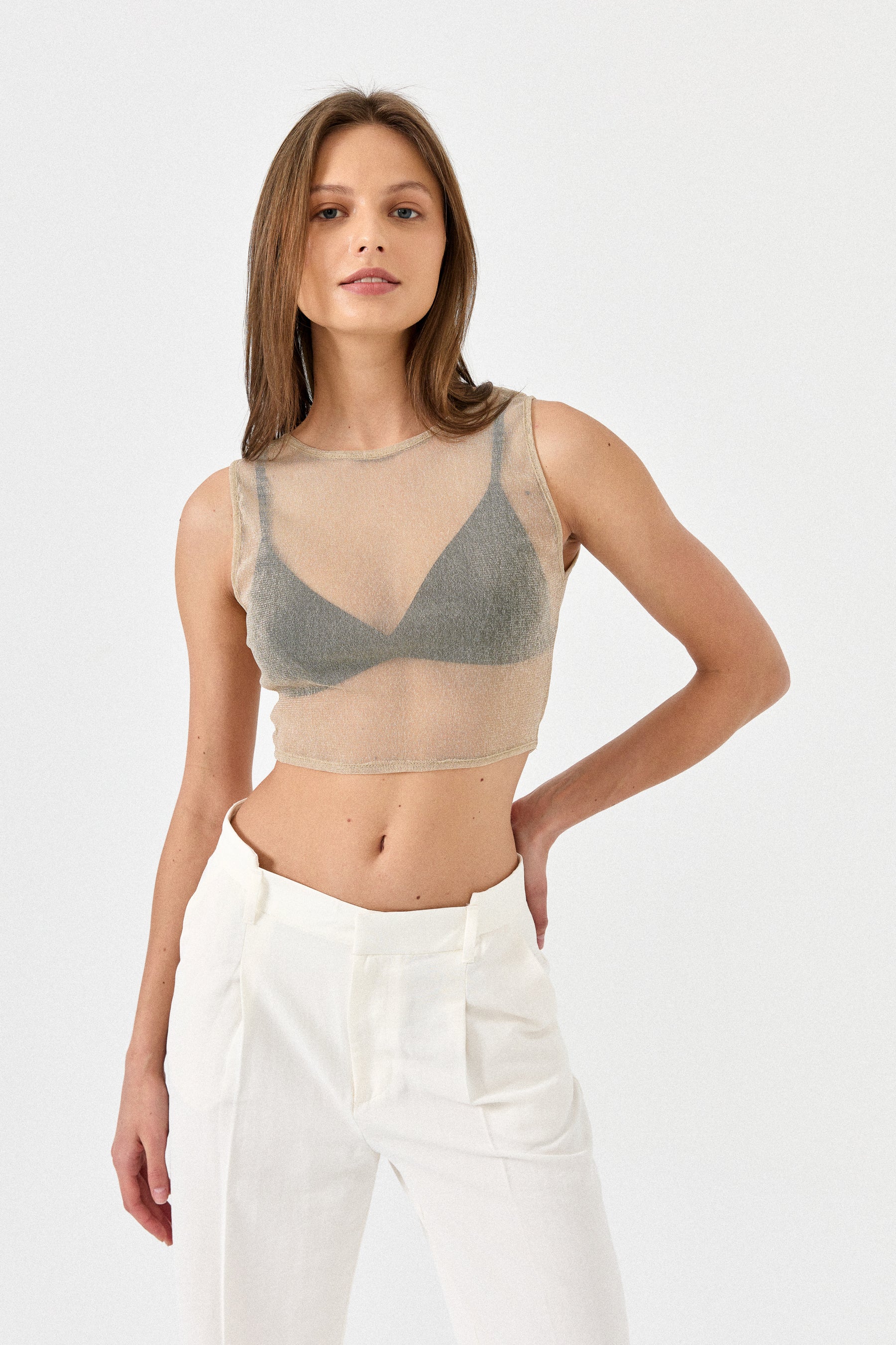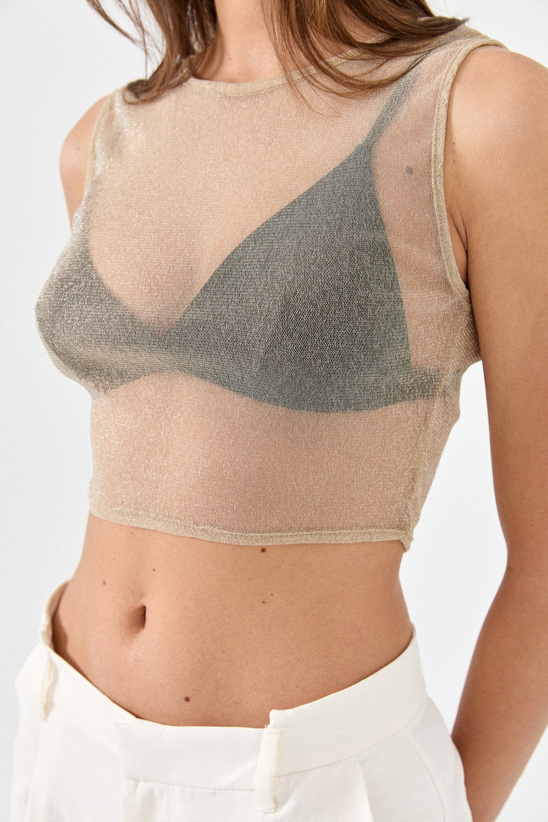 This crop top is great for a night out. The sheer elastic fabric has a subtle glitter, making it a stylish option for an evening plan. Wear it over a bralette and wide leg pants for a chic look.