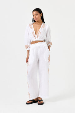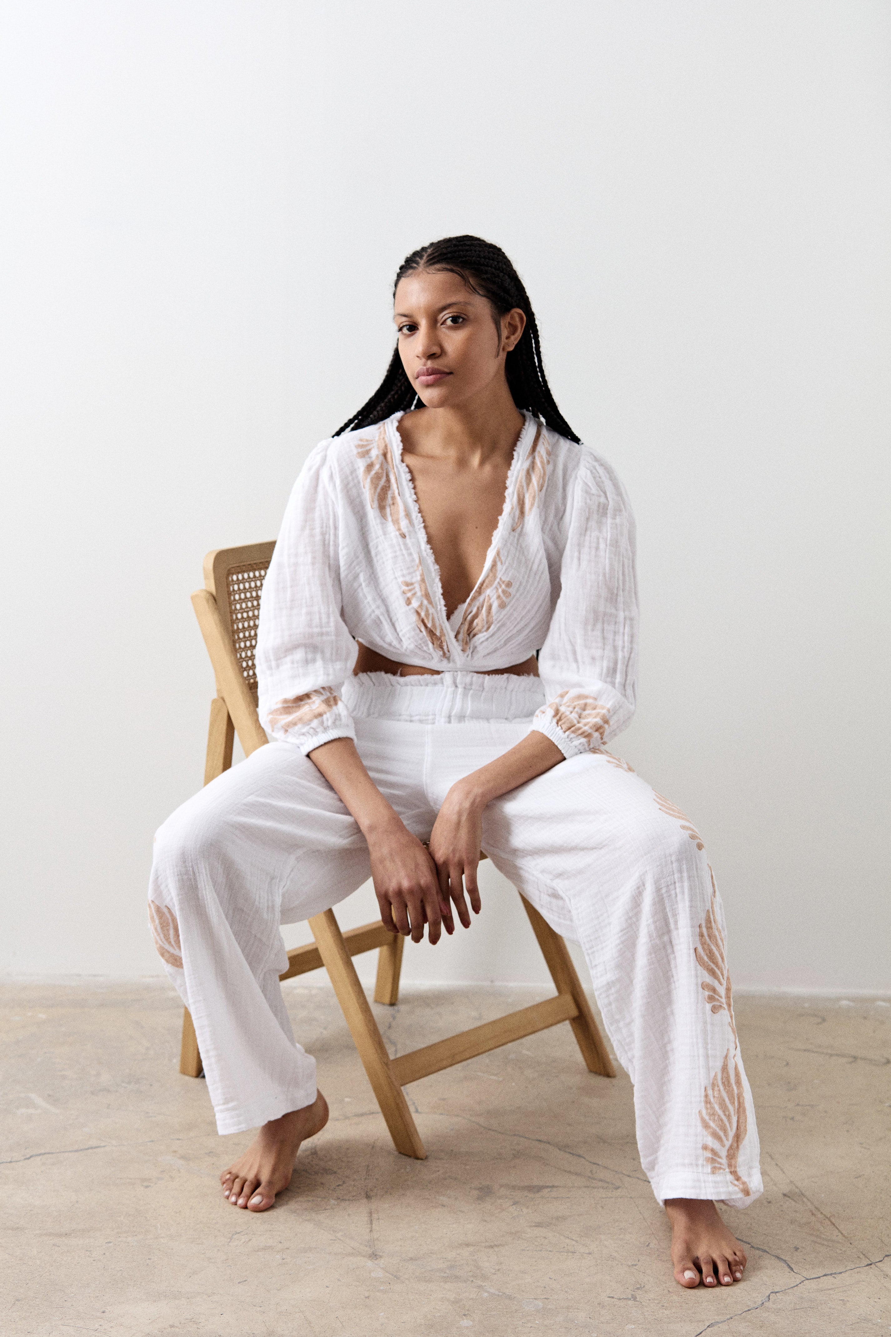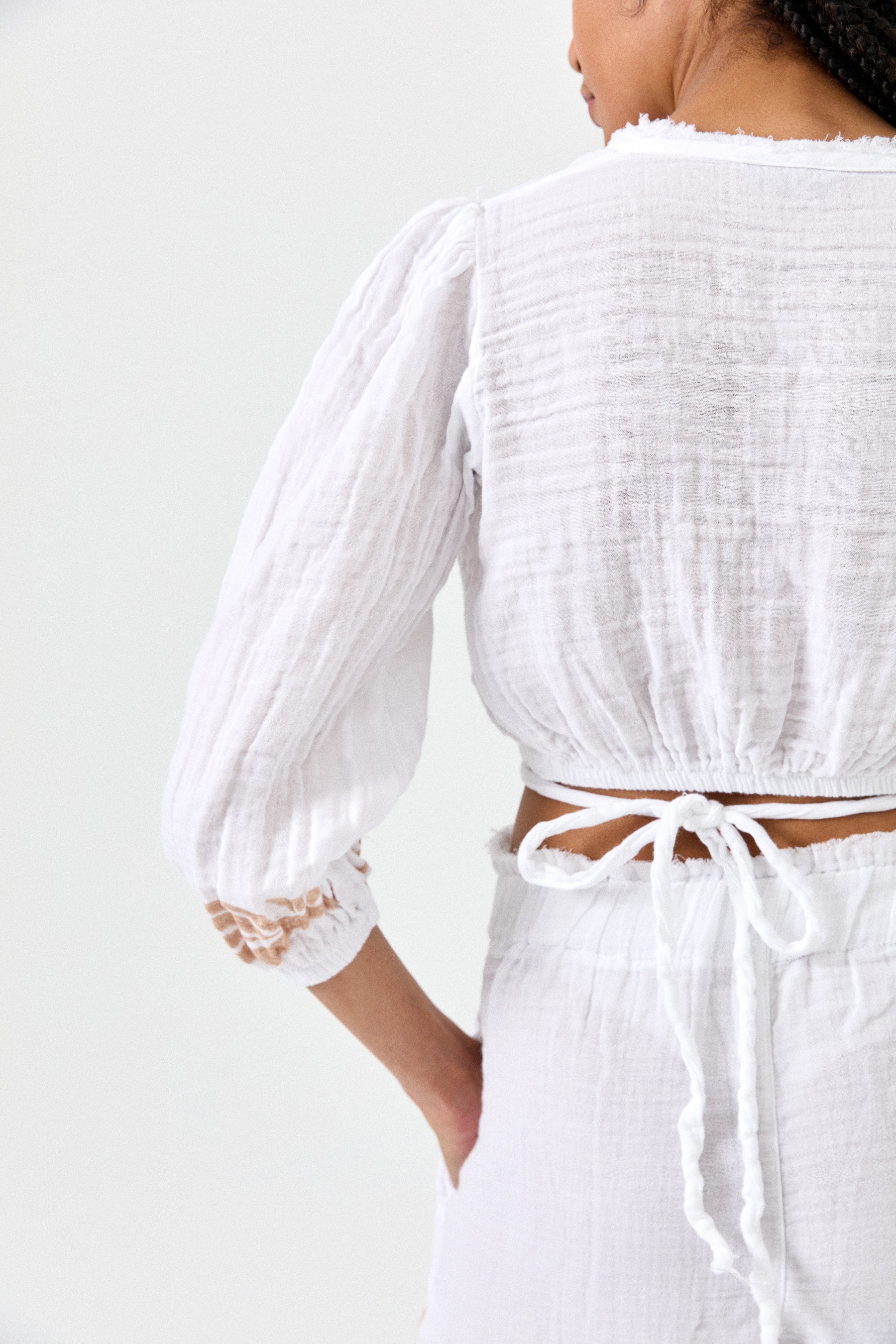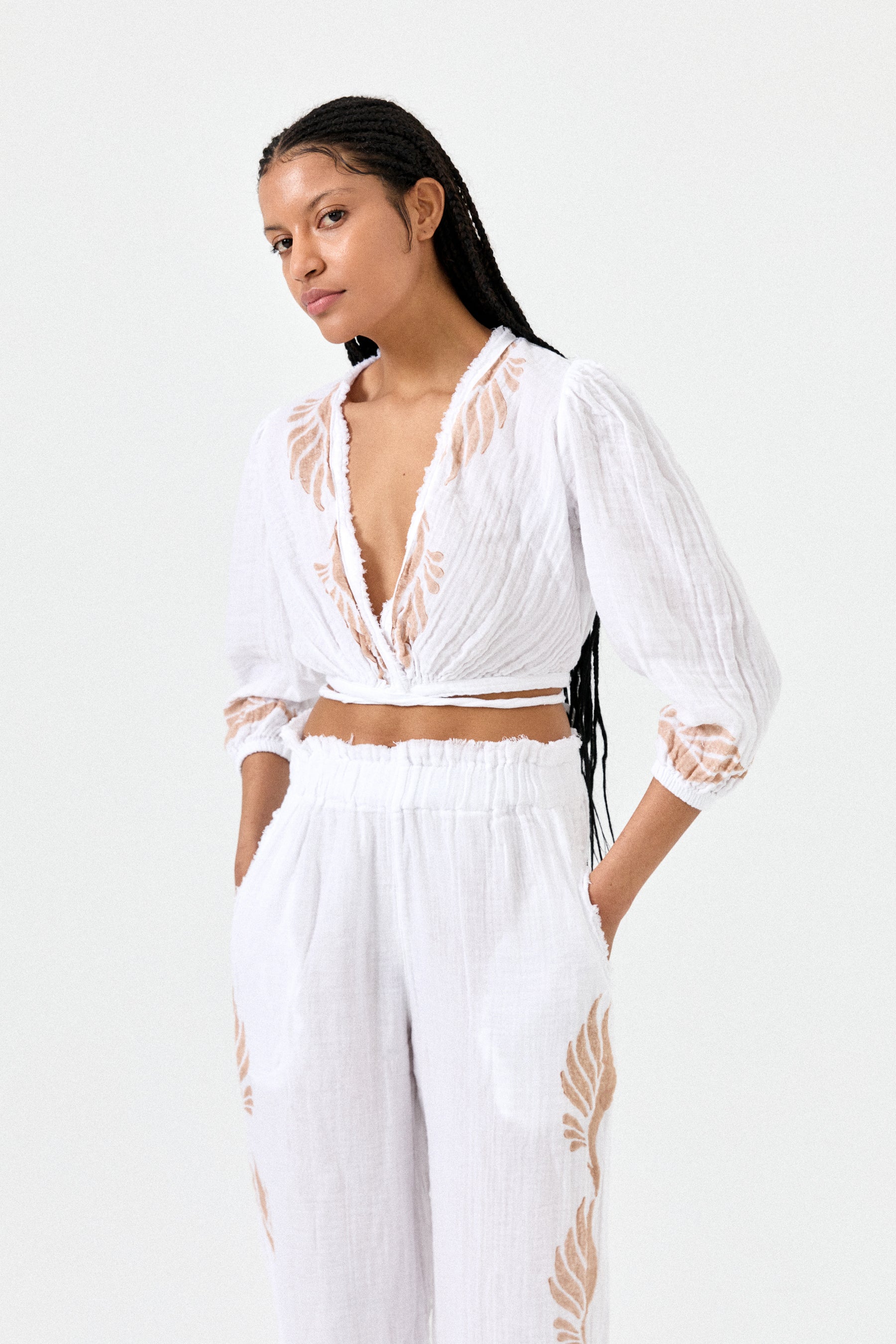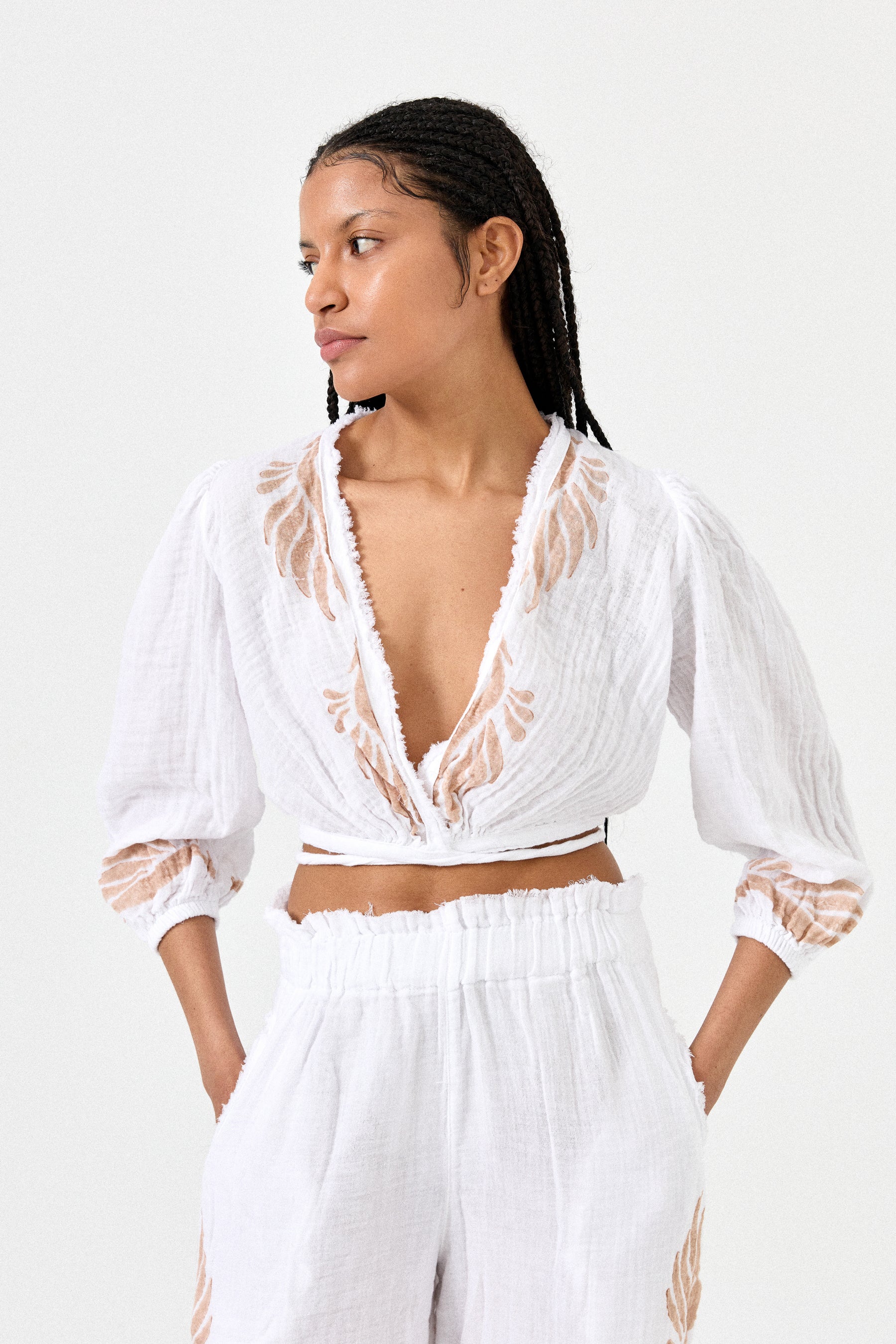 This wrap top is made from soft cotton featuring a unique wood print that is printed by hand. It's comfortable and stylish, perfect for a casual weekend.