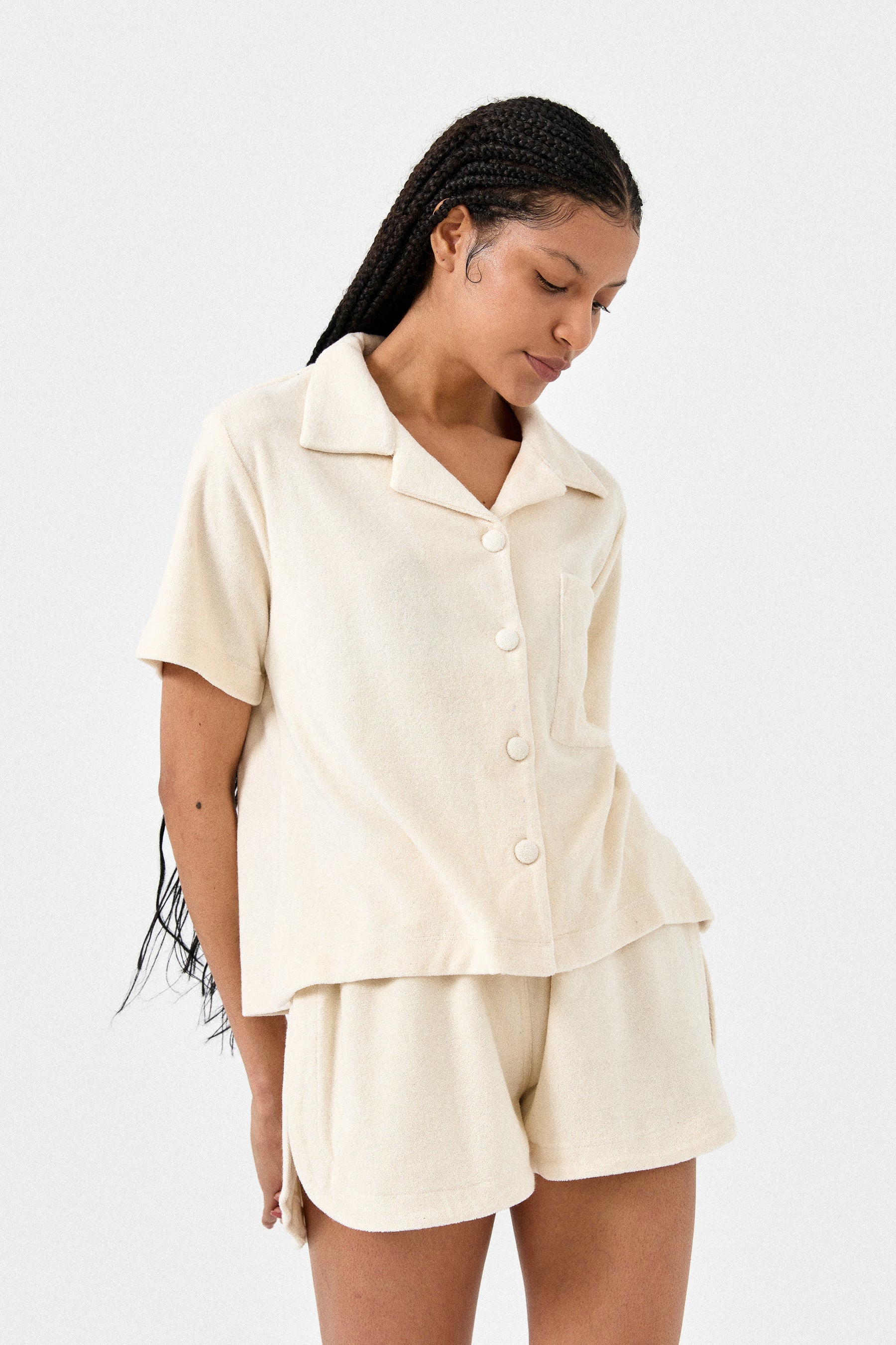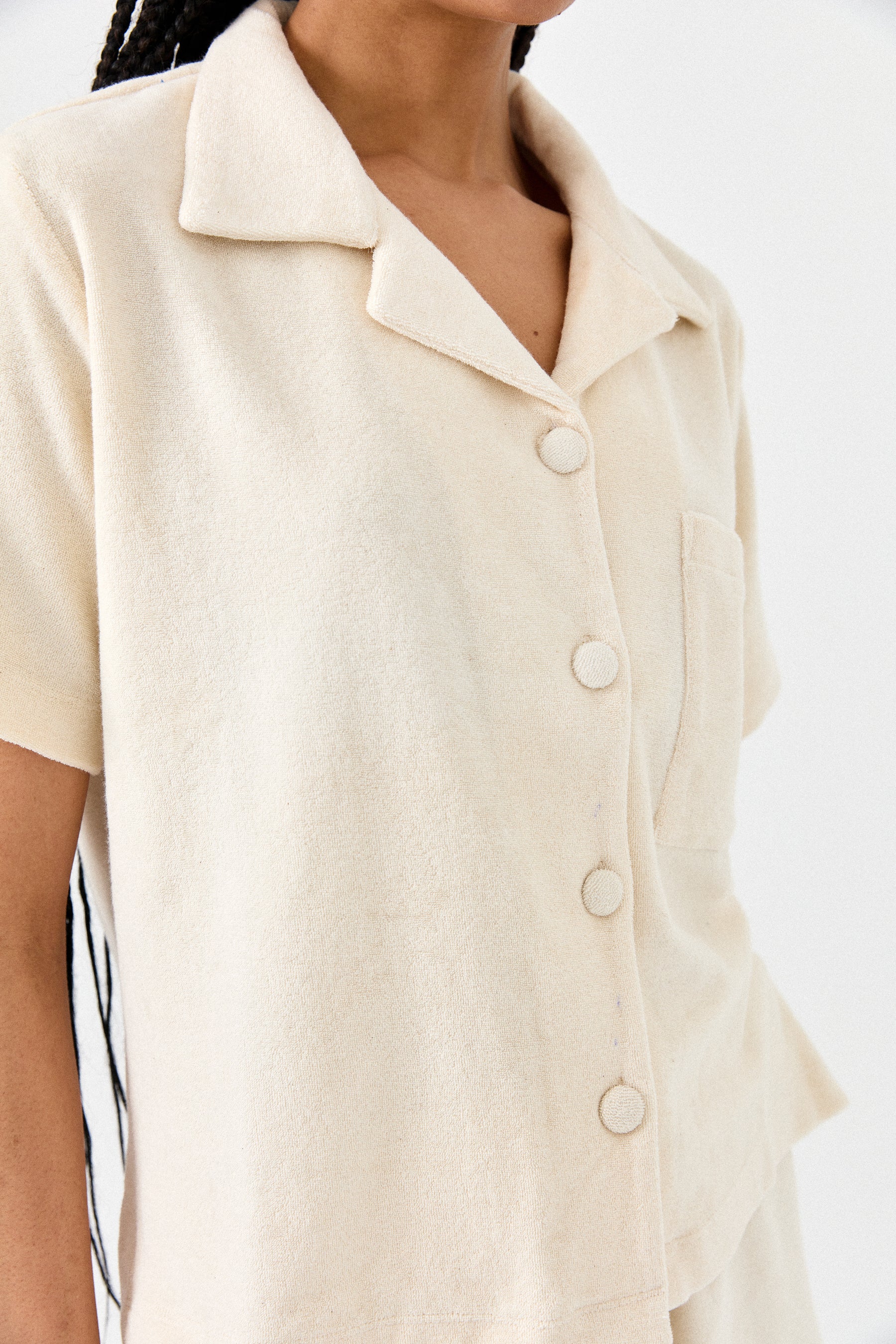 This shirt is a great option for everyday wear. It offers a relaxed fit crafted from soft terry fabric with a versatile ivory color, perfect for creating a casual look.
