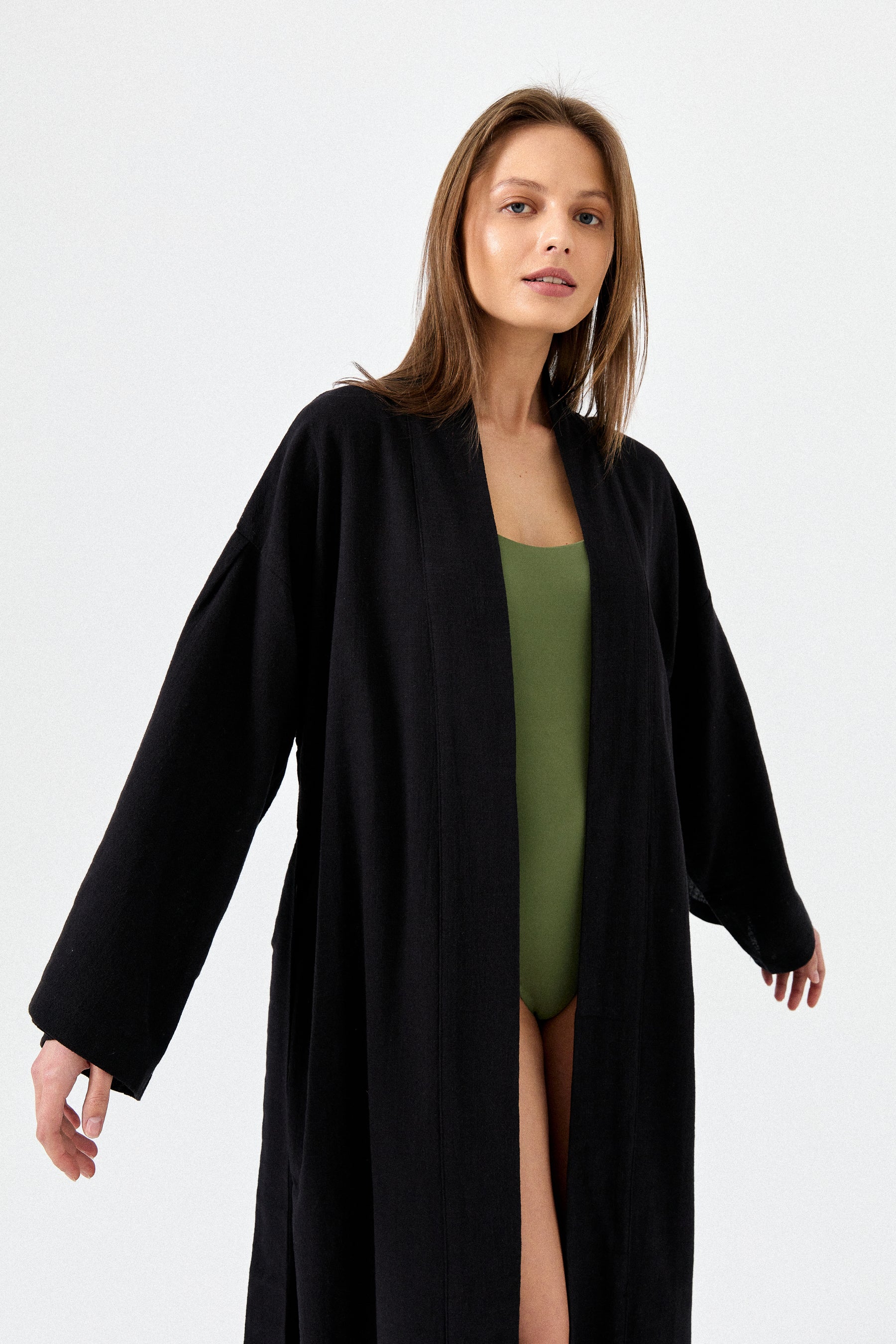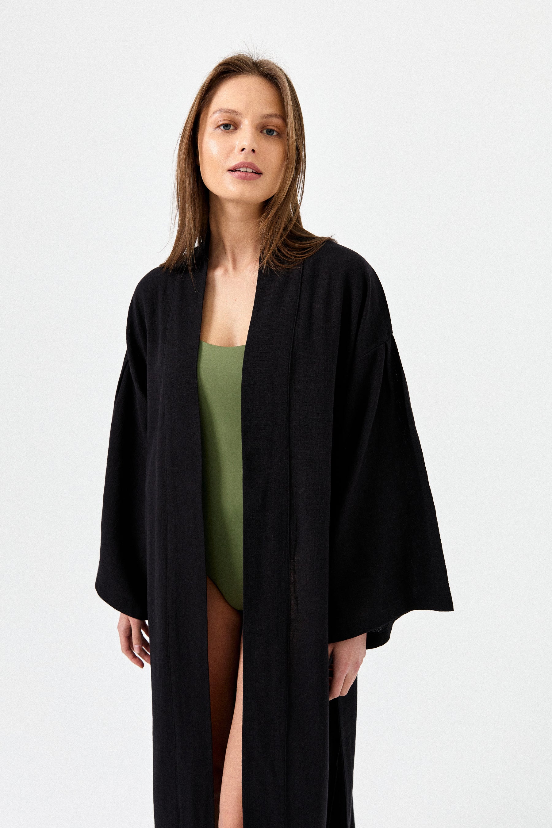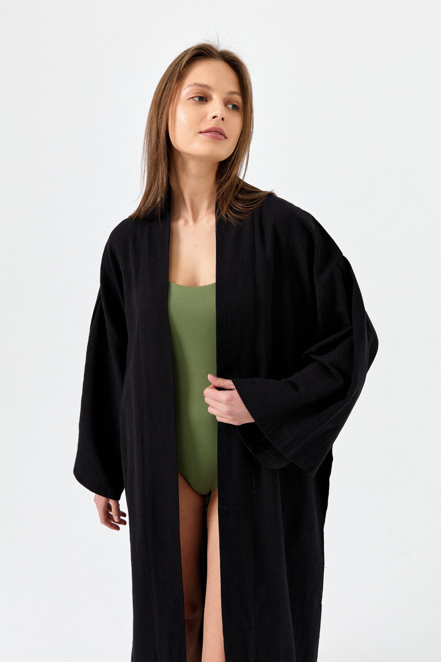 The long kimono is made soft cotton for a comfortable all-day wear. The oversized silhouette adds effortless style to any outfit, whether you're throwing it over a swimsuit, a dress or wearing it with jeans.
